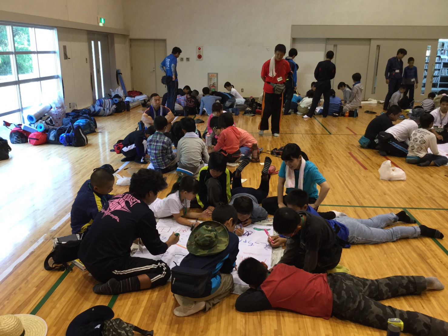 3日目の朝です。出発の前に、各班が初日に話し合ったみんなの思いを、形にして班旗を作っています。