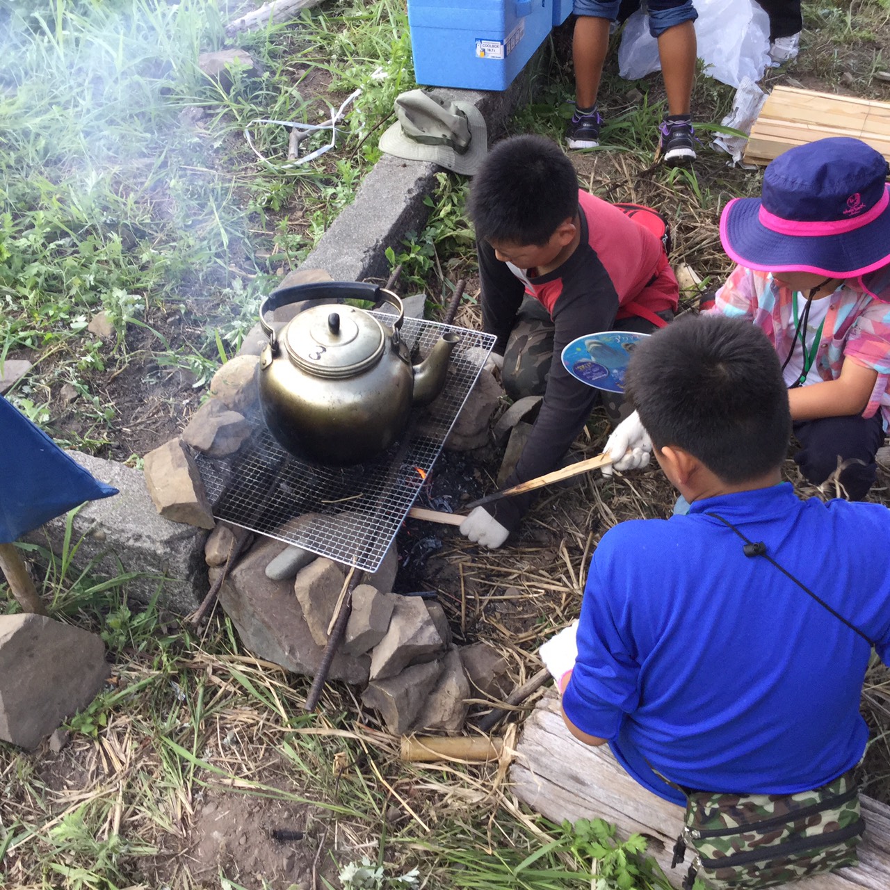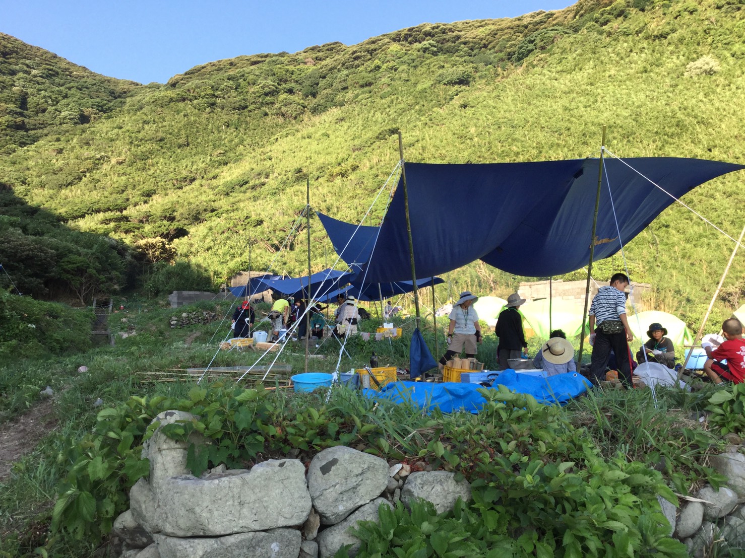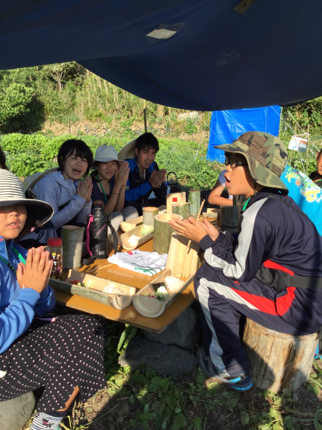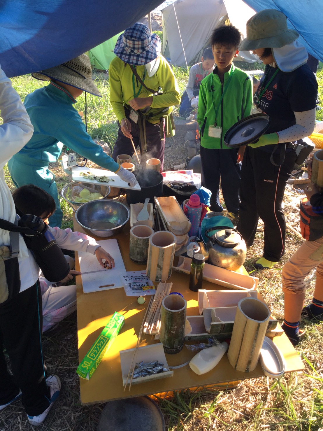入島2日目。各班が朝食を作っています。みそ汁、サラダなど、美味しくいただきました。