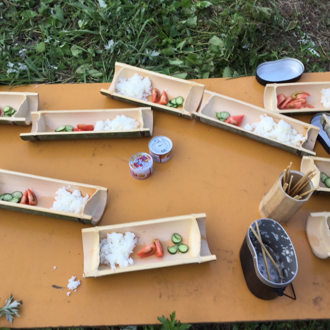 御五神島の生活が始まりました。初日の夕食から、自分たちで作ります。配られた食材を使って、各班、苦労しながら、メニューを考えています。写真は、缶詰を使ったメニューです。