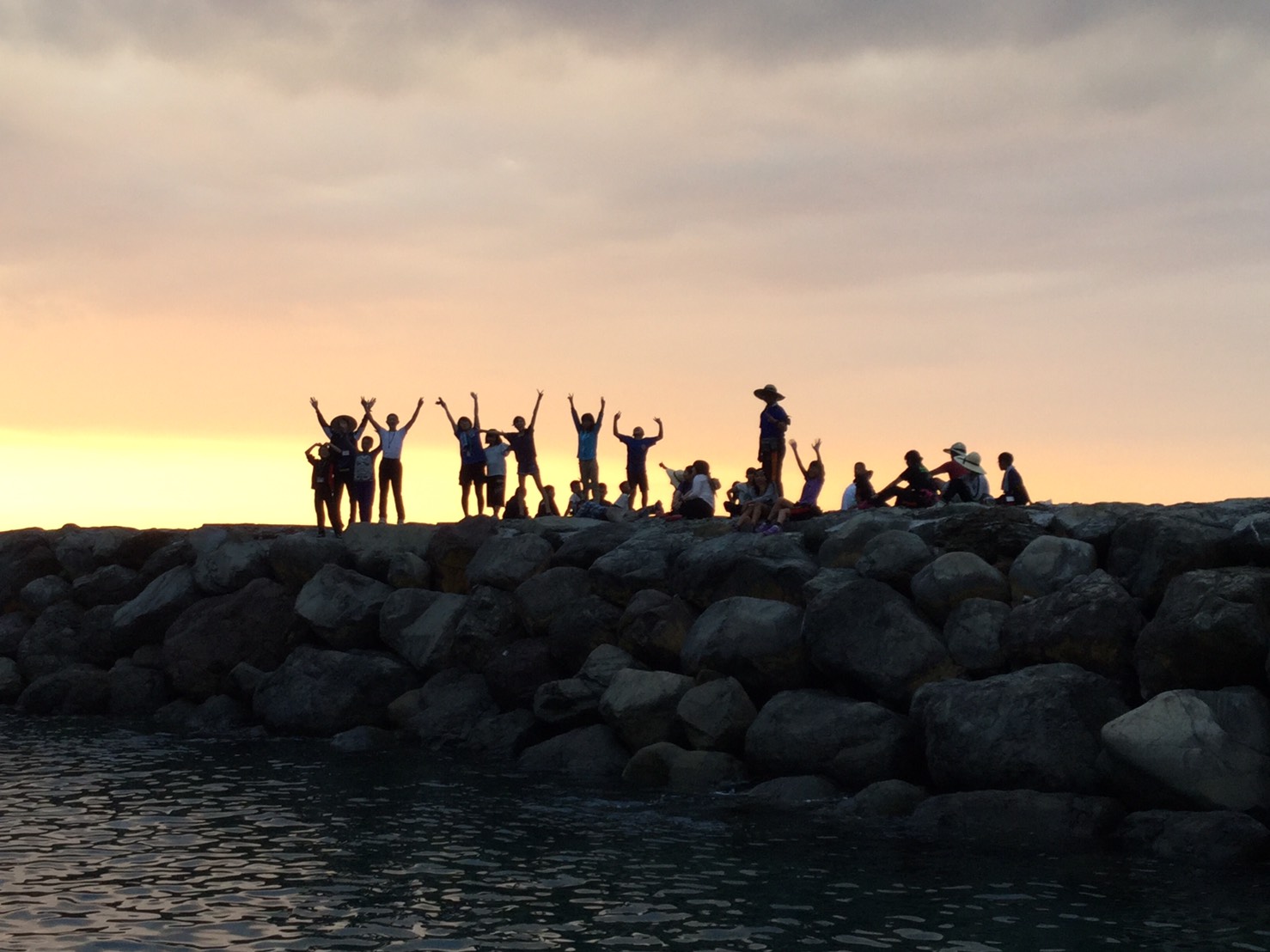 食後のひと時、沈む夕日を眺める子どもたち。日の入り後は、明日に備えてゆっくり休みます。
