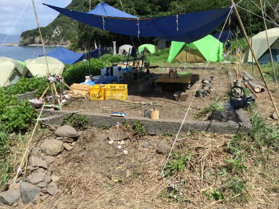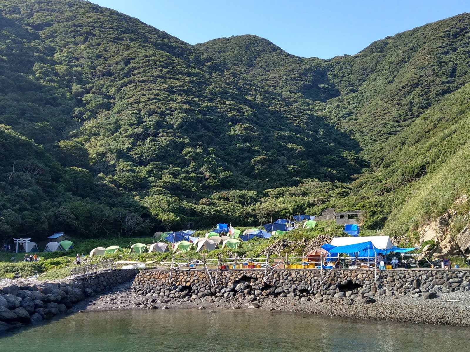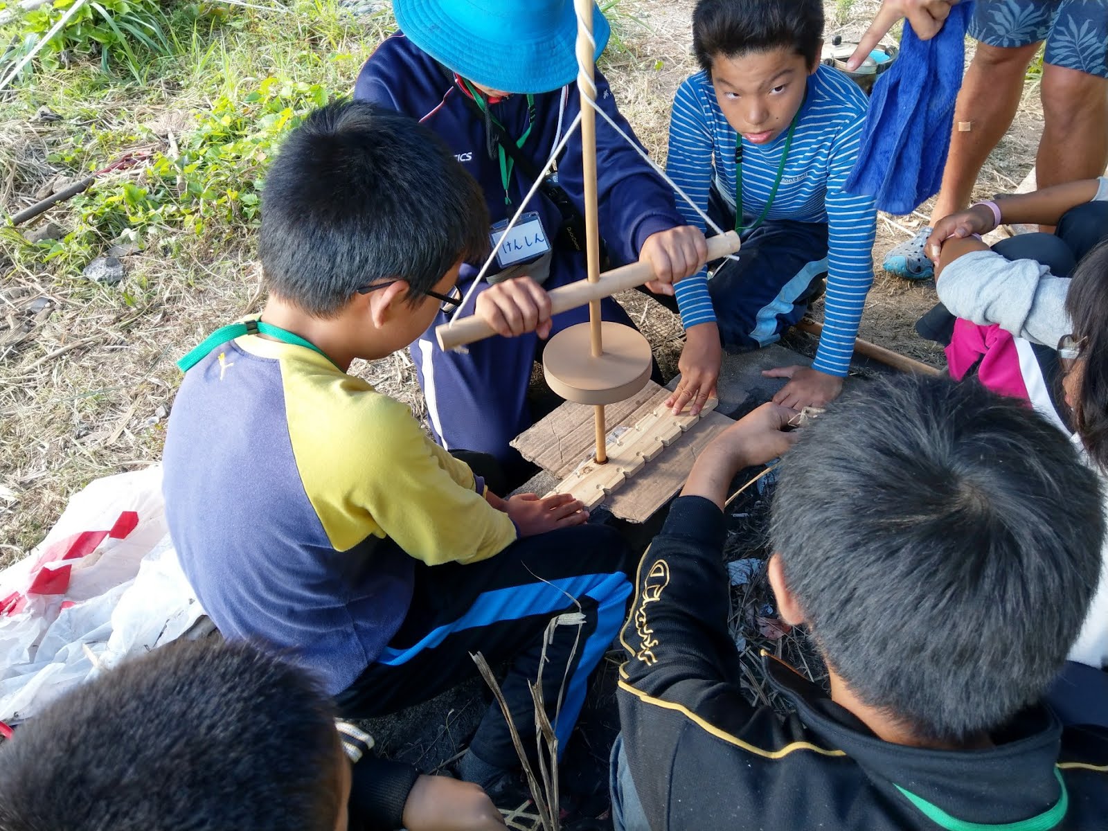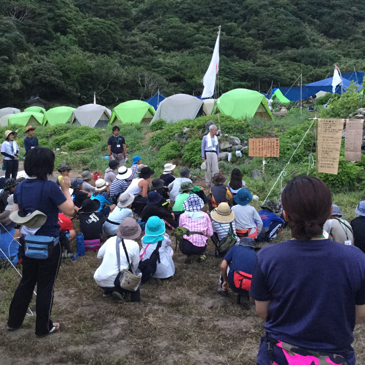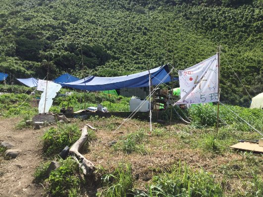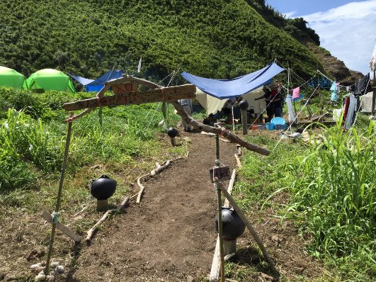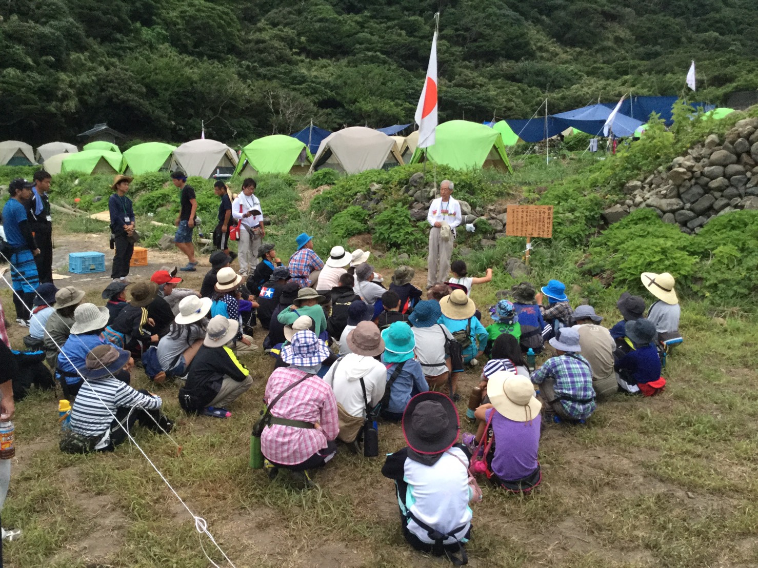 入島4日目の御五神島は、夏の日差しが照り、これまでより暑い朝です。支給されたマッチがなくなり、火起こし器を使って朝ごはんをつくる班や、午後のテントサイトコンテストに備えて準備を進める班など、活発に動いています。