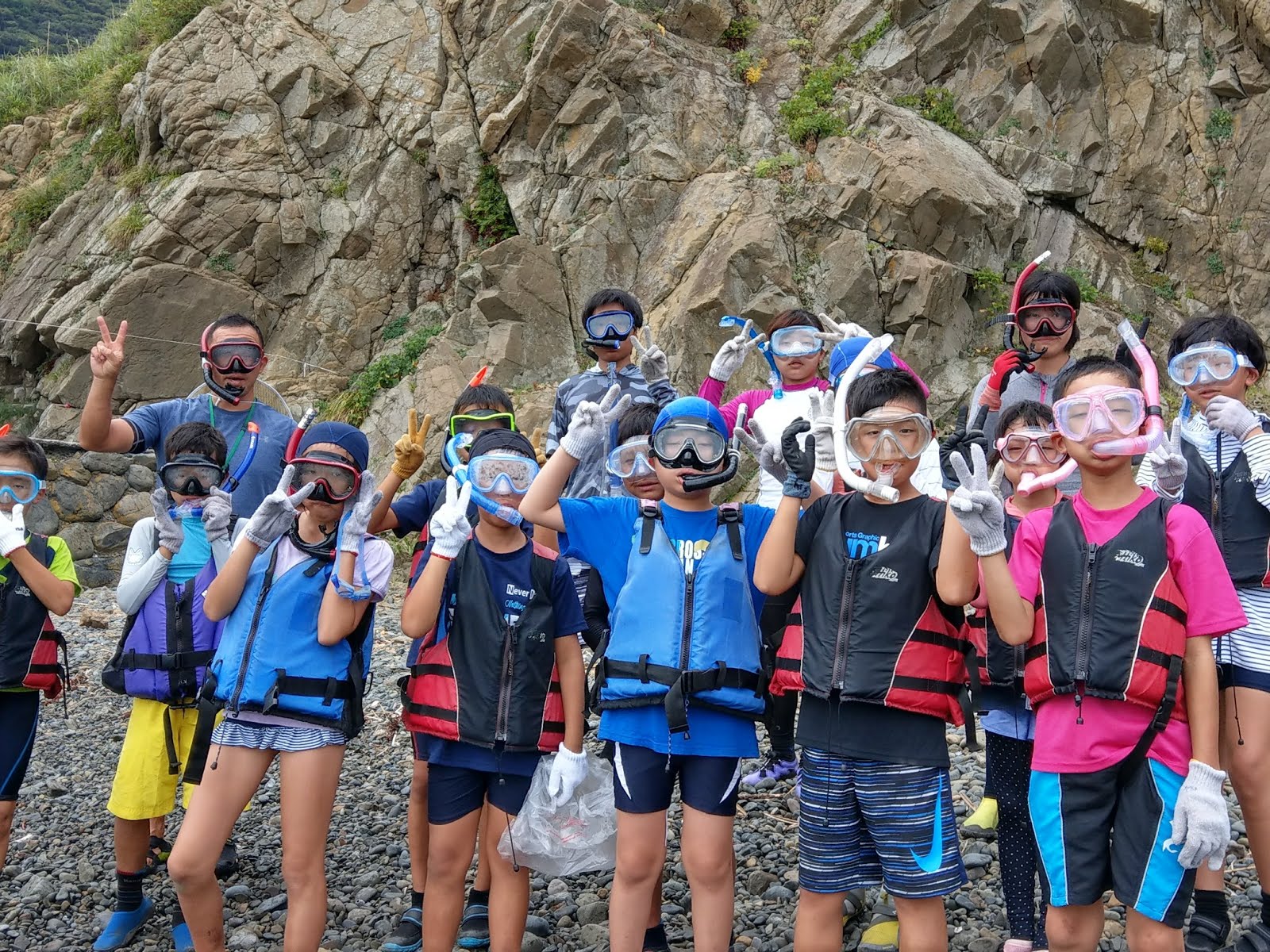 入島3日目の御五神島は曇り空ですが、波穏やかで、爽やかな風が吹き抜けています。子どもたちが楽しみにしていたシュノーケリングが始まり、島の海を堪能しています。